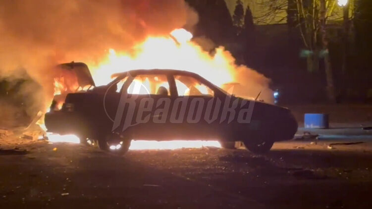На кадрах показывают горящий автомобиль и сообщается, что один из снарядов прилетел в жилой двор.
