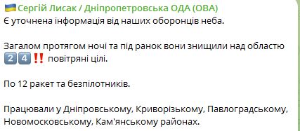 В некоторых районах Днепра после ночной атаки по энергообъектам отсутствует водоснабжение. Также в области введены аварийные отключения света. По данным ОВА, ночью ВСУ сбили над территорией области 12 ракет и 12 "Шахедов".