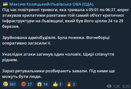 Сегодня ночью во Львовской области крылатые ракеты атаковали тот же объект инфраструктуры, что и во время налетов 24 и 29 марта. Погиб мужчина.