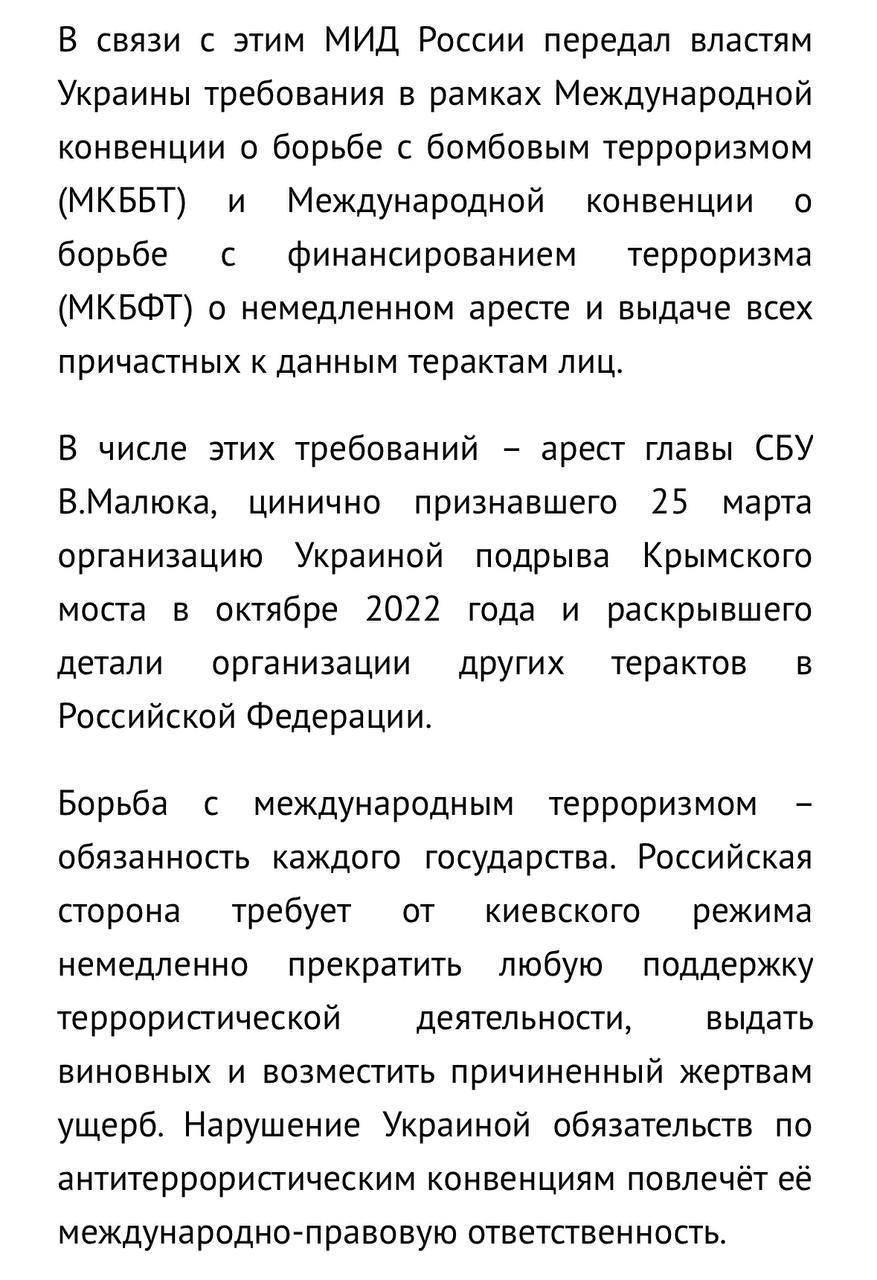 Также Россия требует от Украины ареста главы СБУ Василия Малюка в связи с его заявлениями о причастности к подрыву Крымского моста и к убийству ряда лиц в РФ, в частности, блогера Владлена Татарского.