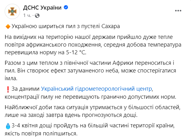 В ГСЧС предупредили, что пыль из Сахары будет висеть над Украиной ближайшие сутки