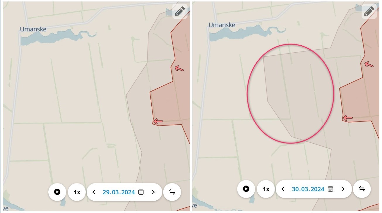 Что же до итогов этой атаки, то, судя по карте Deep State, "серая зона" к западу от Тоненького и в направлении Уманского существенно возросла как раз 30 марта, когда этот бой состоялся.