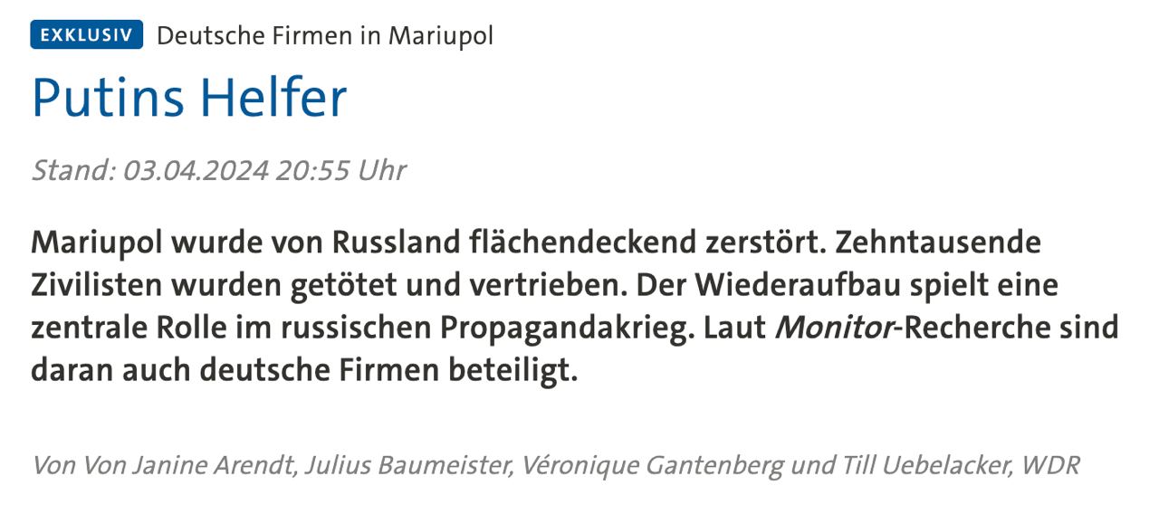 10.50 Немецкие компании помогают РФ восстанавливать захваченный и разрушенный Мариуполь, пишет Tagesschau.