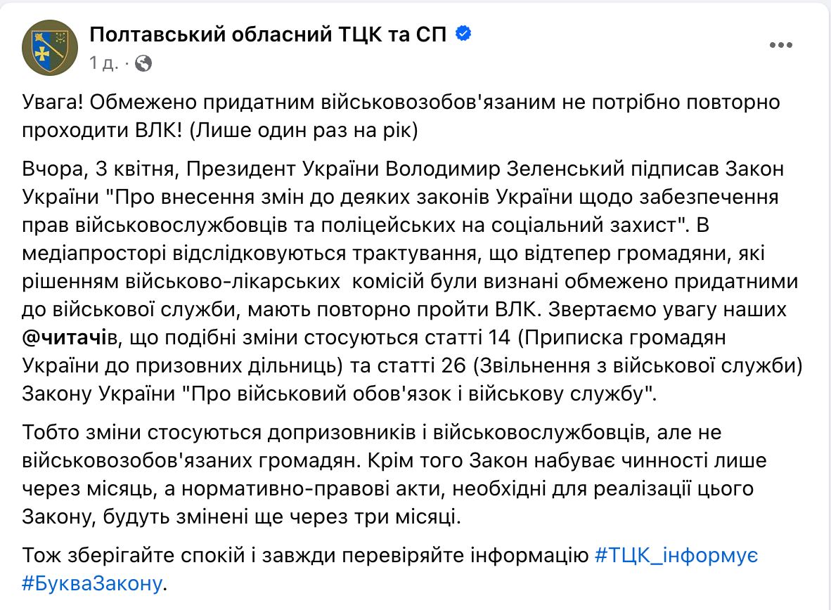 В Полтавском ТЦК отрицают, что ограниченно годные граждане должны повторно пройти военно-врачебную комиссию (ВВК) в связи с ликвидацией такого статуса.