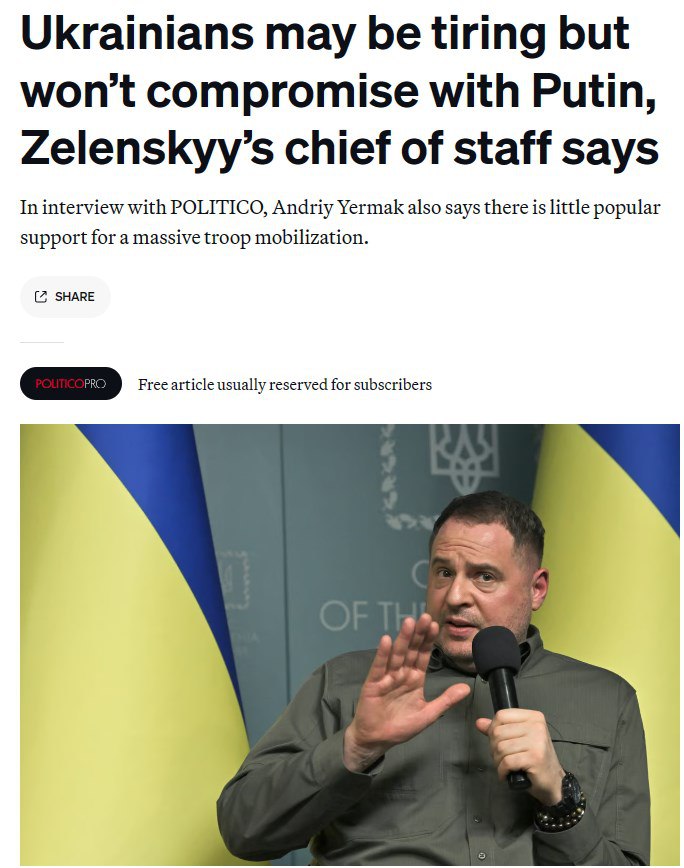 19.18 Украинцы устали от войны, однако на компромиссы с Россией Киев не пойдет, заявил глава Офиса президента Андрей Ермак изданию Politico.