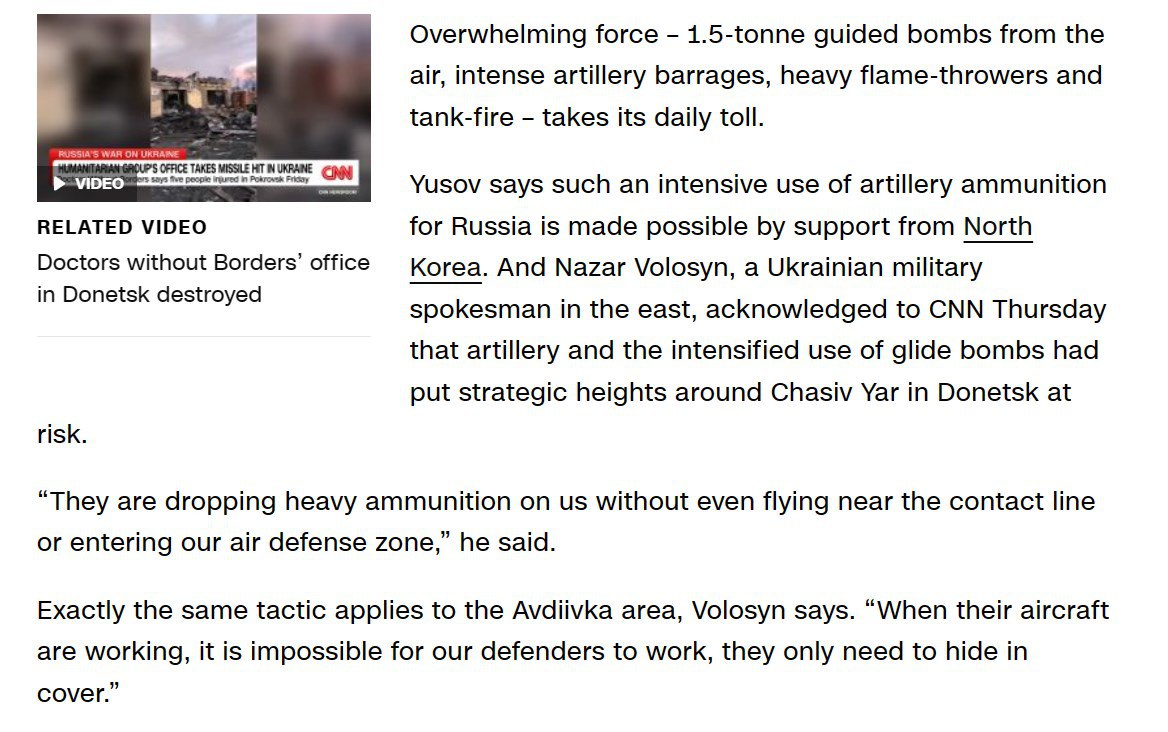 "Назар Волошин, официальный представитель украинской армии на востоке, признал, что артиллерия и более активное использование планирующих бомб поставили под угрозу стратегические высоты вокруг Часового Яра в Донецкой области", - пишет издание.