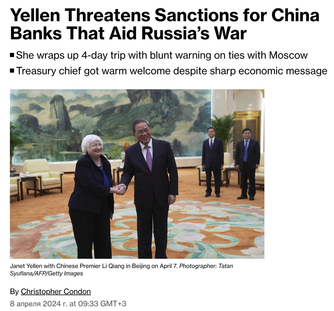 "Я подчеркнула, что компании, в том числе в КНР, не должны оказывать материальную поддержку войне России, и что они столкнутся со значительными последствиями, если они это сделают. Любые банки, которые содействуют крупным транзакциям, направляющим товары военного назначения или двойного назначения на российскую оборонно-промышленную базу, подвергают себя риску санкций США", — заявила Йеллен в резиденции посла США в Пекине.