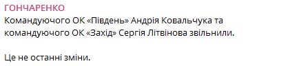 Были уволены командующие Оперативного командования "Юг" и "Запад" Андрей Ковальчук и Сергей Литвинов.