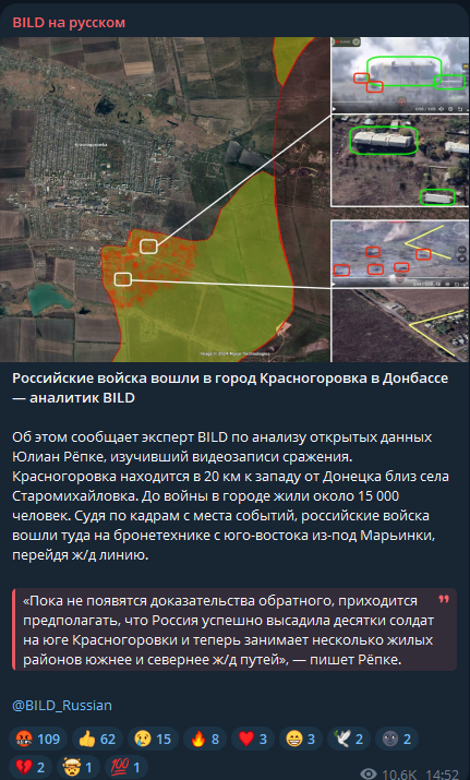 "Пока не появятся доказательства обратного, приходится предполагать, что Россия успешно высадила десятки солдат на юге Красногоровки и теперь занимает несколько жилых районов южнее и севернее железнодорожных путей", — написал Рёпке.