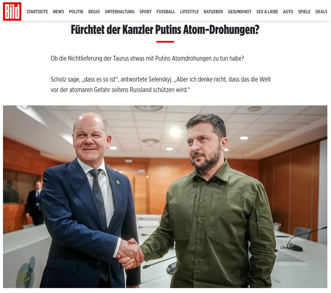 16.30 Шольц не передает Украине Taurus из-за ядерных угроз Путина, заявил Зеленский в интервью Bild.