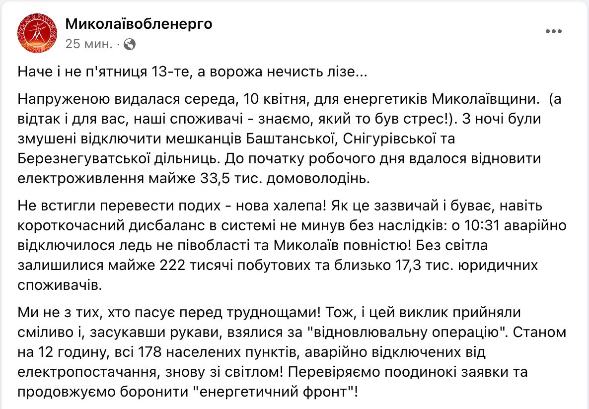 12:56 Весь Николаев и половина области оставались без света, сообщает облэнерго.