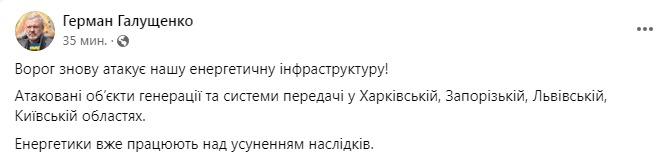 07:30 Войска РФ ранним утром 11 апреля атаковали энергетическую инфраструктуру в четырех областях: Харьковской, Запорожской, Львовской и Киевской. Об этом сообщает министр энергетики Герман Галущенко.