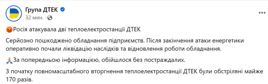 07:46 Группа ДТЭК сообщает об ударах по двум ее теплоэлектростанциям, там серьезно повреждено оборудование.