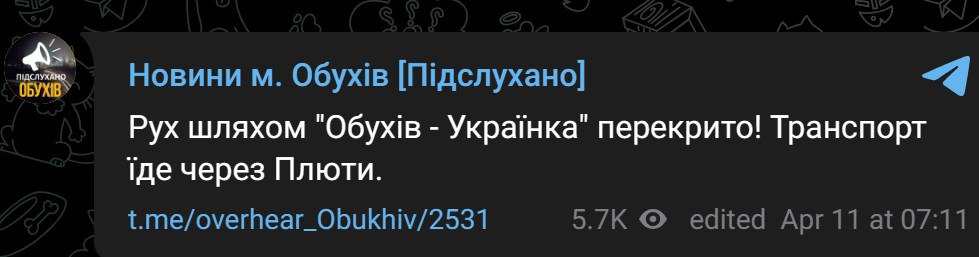 09:08 Телеграм-каналы Обуховского района пишут о том, что после прилетов по Киевской области перекрыта дорога Обухов-Украинка.