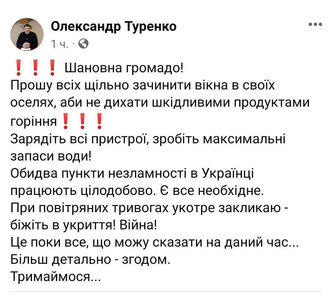10:16 Мэр Украинки (Киевская область) Александр Туренко призвал жителей "плотно закрыть окна в своих домах, чтобы не дышать вредными продуктами горения", зарядить все устройства и сделать максимальные запасы воды.