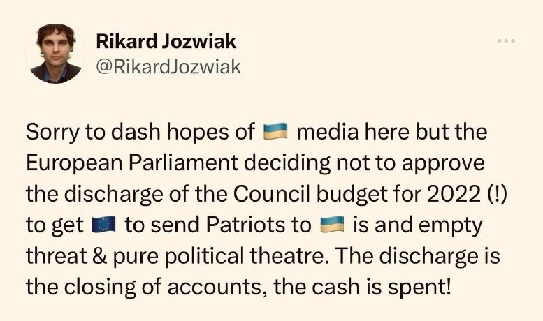 "Извините, что разбиваю надежды украинских СМИ, но решение Европейского парламента не утверждать бюджет Совета ЕС на 2022 год (!) для отправки Patriot - это пустые угрозы и чистый политический театр", - заявил Джозвяк.