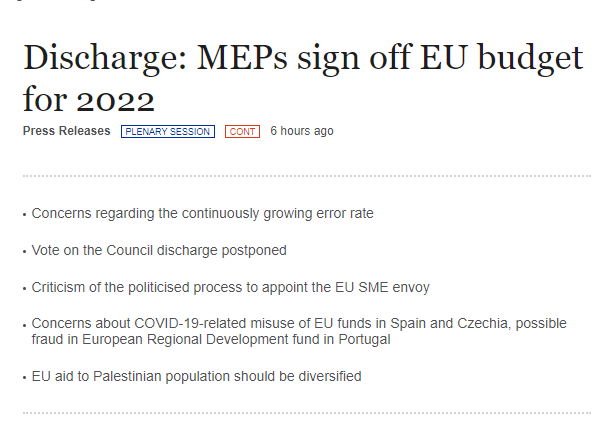 Согласно информации на сайте Европарламента, сегодня евродепутаты обсуждали исполнение бюджета ЕС на 2022 год. В ходе обсуждения было подтверждено исполнение бюджета Еврокомиссии, всех децентрализованных агентств и развивающихся фондов. В целом депутаты выразили удовлетворение работой Еврокомиссии по управлению бюджетом, однако отметили высокий уровень ошибок в расходах на 2022 год. Пресс-служба отметила проблемы с невыполненными обязательствами ЕС за 2022 год и возможное нецелевое использование средств в связи с COVID-19 и другими факторами.