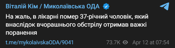 "К сожалению, в больнице скончался 37-летний мужчина, который в результате вчерашнего обстрела получил тяжелые ранения", - написал он.