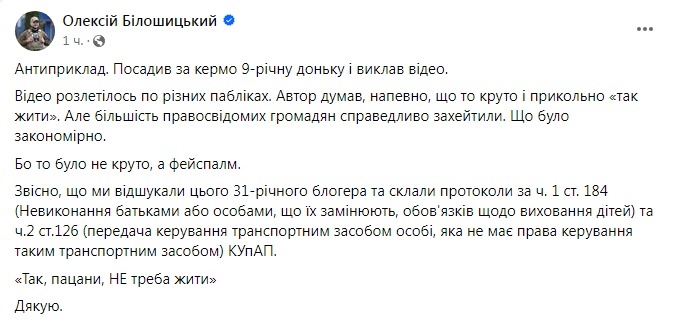 "Антипример. Посадил за руль 9-летнюю дочь и выложил видео. Видео разлетелось по разным пабликам. Автор думал, наверное, что это круто и прикольно "так жить". Но большинство правосознательных граждан справедливо захейтили. Что было закономерно. Потому что это было не круто, а фейспалм", - написал Белошицкий.