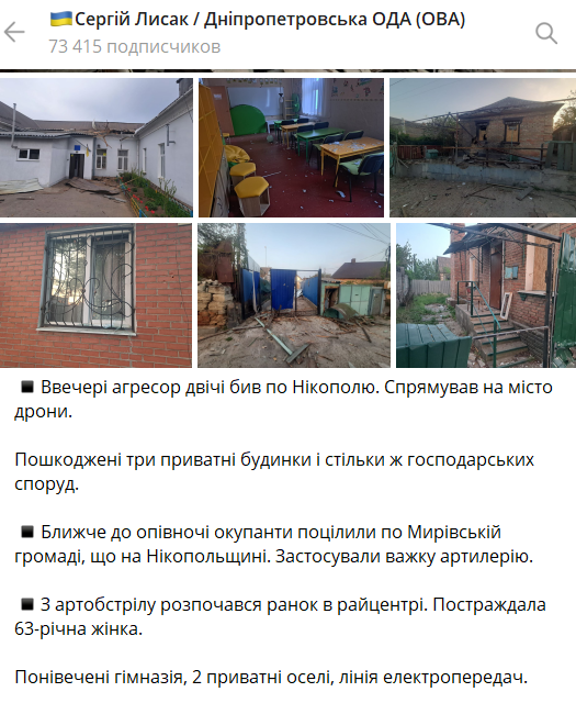 Лысак добавил, что накануне вечером российские военные дважды запустили дроны по Никополю. Пострадали три частных дома и три хозяйственных постройки.