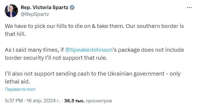 "Нам нужно выбрать холмы, на которых мы сможем умереть, и захватить их. Наша южная граница – этот холм. Как я уже много раз говорила, если пакет спикера Джонсона не включает безопасность границ, я не буду поддерживать это правило. Я также не поддержу отправку денег украинской власти – только летальную помощь", – гласит пост Спартц.