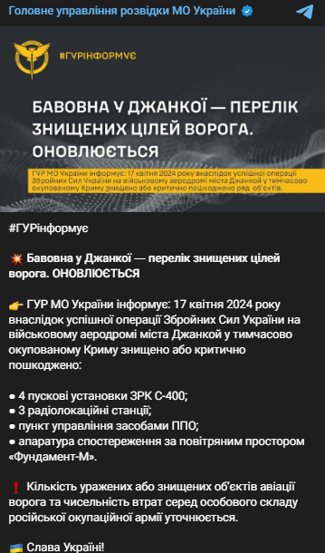 Ранее представитель ГУР Андрей Юсов сообщил, что на военном аэродроме в Джанкое ударом 17 апреля были поражены пусковые установки комплексов противоракетной, противовоздушной обороны, радиолокационные системы и самолеты российской армии.