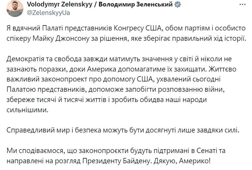 21:28 Зеленский поблагодарил Палату представителей Конгресса США и «лично спикера Джонсона» за проголосованный законопроект о поддержке.