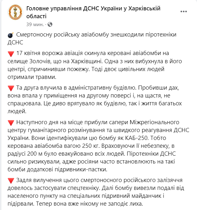 "В Золочевской громаде Харьковской области пиротехники ГСЧС изъяли и уничтожили управляемую авиабомбу КАБ-250", - говорится в сообщении.