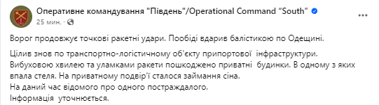 Враг продолжает точечные ракетные удары. После обеда ударил баллистикой по Одесской области. Целил снова по транспортно-логистическому объекту припортовой инфраструктуры", - говорится в сообщении.