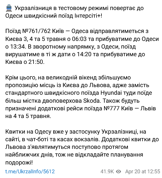 В "Укрзализныце" добавили, что билеты в Одессу уже доступны в приложении компании, а также на официальном сайте, в чат-боте и кассах вокзалов.
