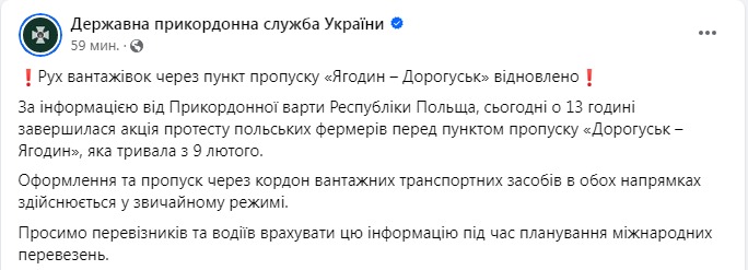 "Движение грузовиков через пункт пропуска "Ягодин – Дорогуск" восстановлено. По информации от Пограничной стражи Республики Польша, сегодня в 13:00 завершилась акция протеста польских фермеров перед пунктом пропуска "Дорогуск – Ягодин", которая длилась с 9 февраля.