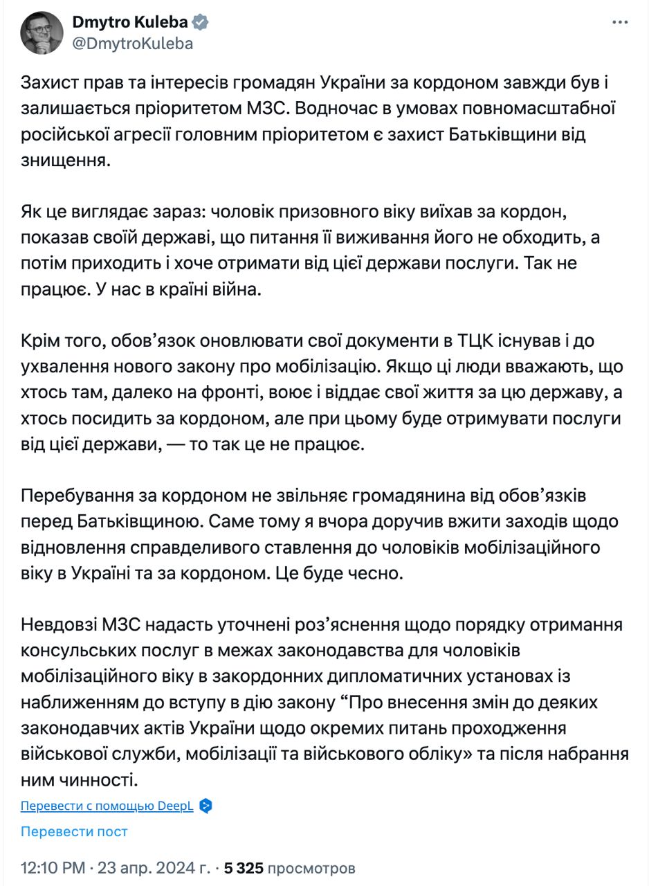 "Как это выглядит сейчас: человек призывного возраста выехал за границу, показал своему государству, что вопрос его выживания его не касается, а потом приходит и хочет получить от этого государства услуги. Если эти люди считают, что кто-то там, далеко на фронте, воюет и отдает свои жизни за это государство, а кто-то посидит за границей, но при этом будет получать услуги от этого государства, - то так это не работает", -  пишет Кулеба в Х.