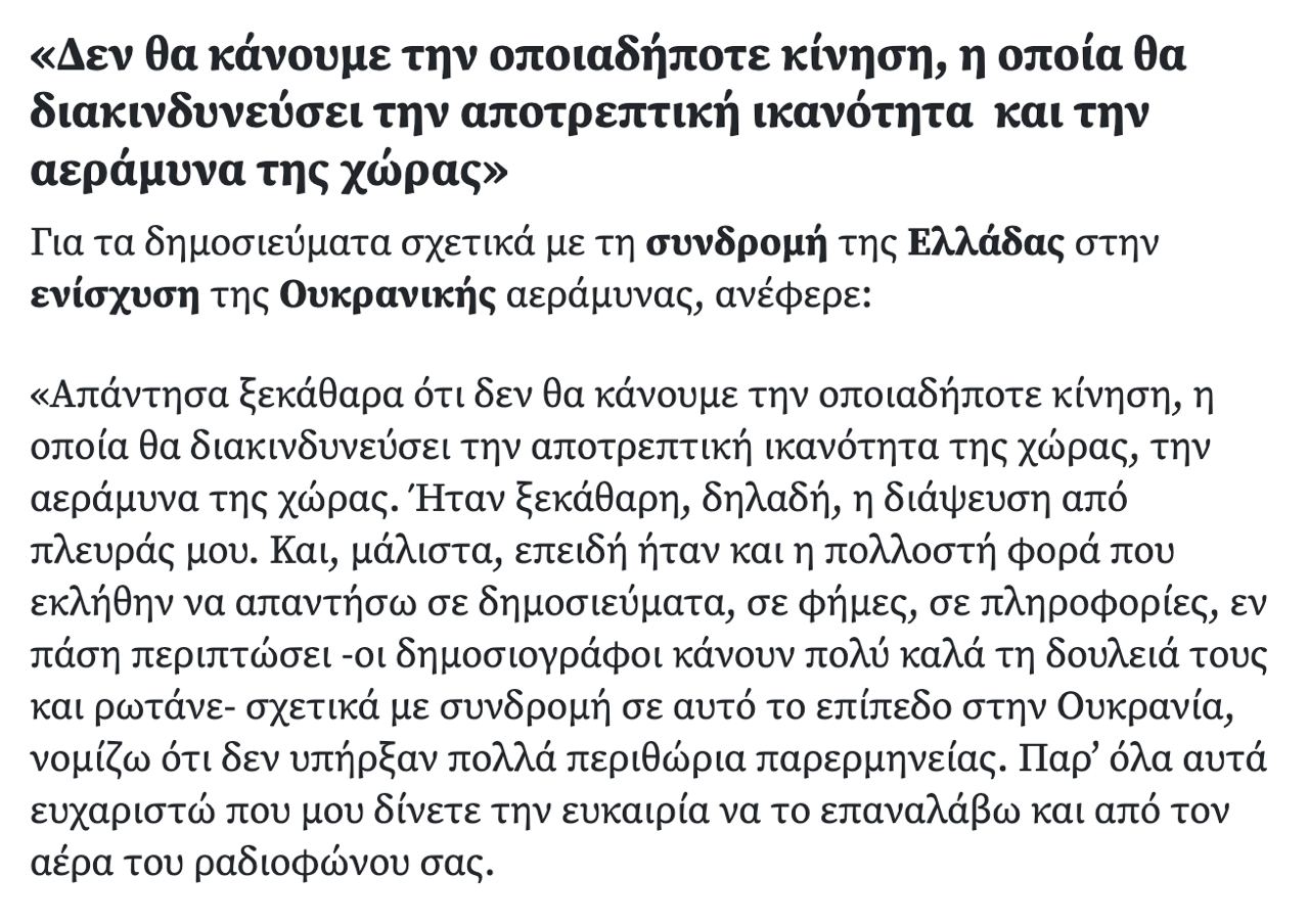 Накануне он заявил, что Греция уже передала Киеву "ощутимую помощь" и не собирается делать ничего, что может "даже отдаленно поставить под угрозу способность нашей страны к сдерживанию или противовоздушной обороне".