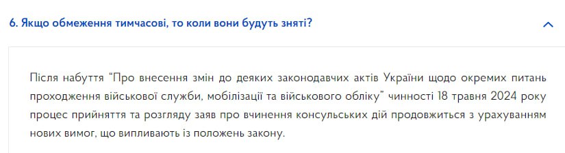 Также сообщается, что запрет на консульские услуги касается только новых заявлений от мужчин мобилизационного возраста.