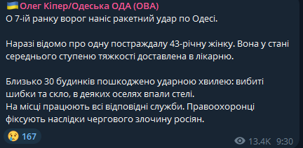 "В 7 утра враг нанес ракетный удар по Одессе. Пока известно об одной пострадавшей 43-летней женщине. Она в состоянии средней степени тяжести доставлена в больницу", - заявил Кипер.