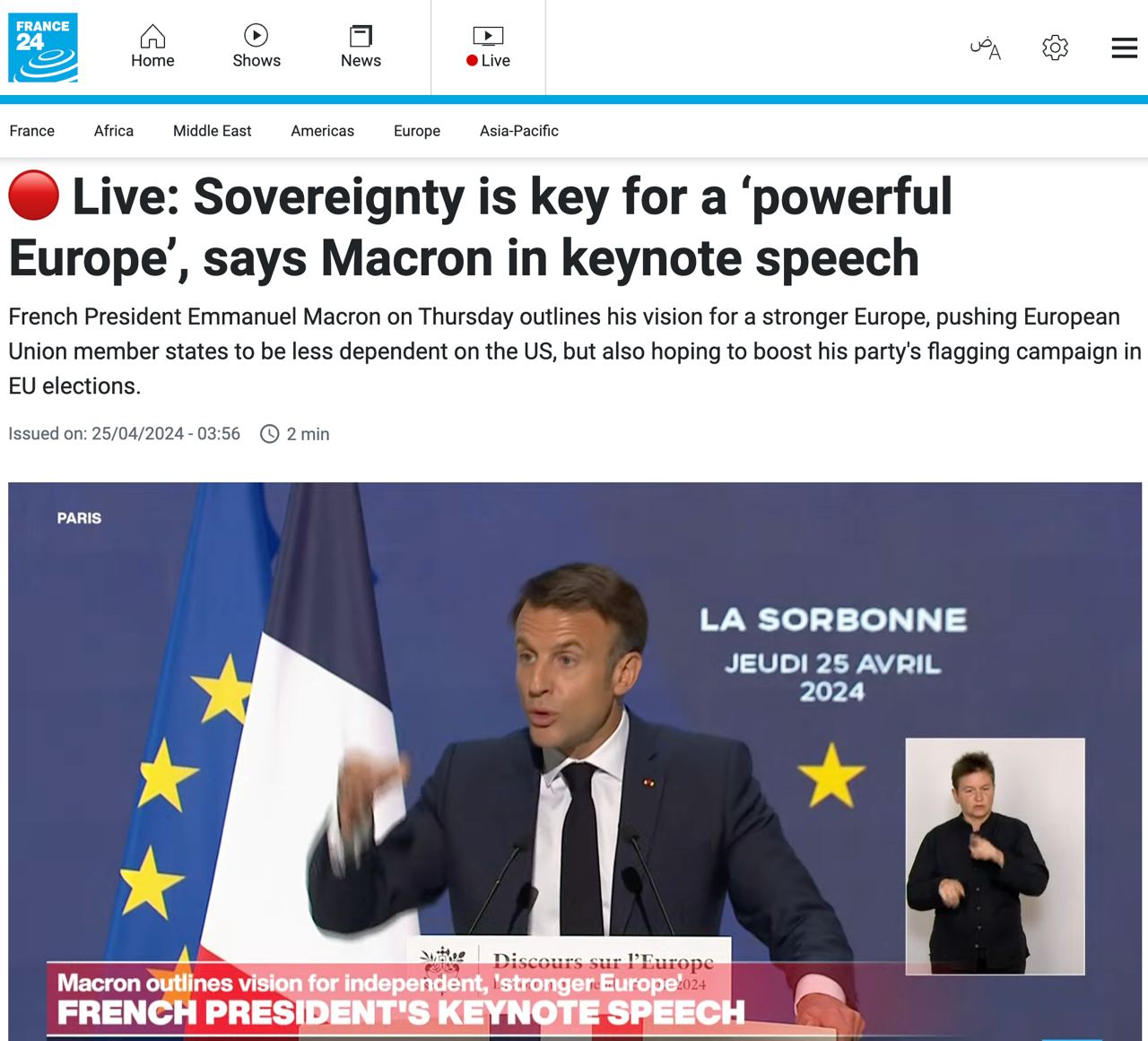 "Наша Европа сегодня смертна и может умереть. Она может умереть, и это зависит только от нашего выбора. Нам необходимо построить эту стратегическую концепцию надежной европейской обороны для себя. Как мы можем построить наш суверенитет, нашу автономию, если мы не возьмем на себя ответственность за развитие нашей собственной европейской оборонной промышленности? Европа должна показать, что она никогда не была вассалом Соединенных Штатов и что она также знает, как разговаривать со всеми другими регионами мира", - заявил Макрон.