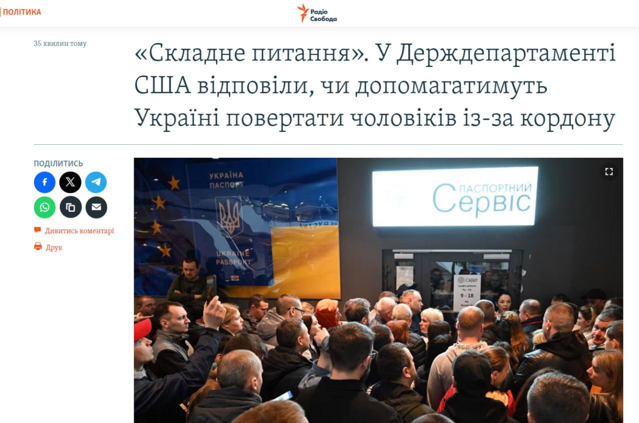 "Сложный вопрос, понятно, что делать особенно с мужчинами, которые сейчас вне Украины. Но власти Украины вправе определять свою политику", – отметил сотрудник Госдепартамента.