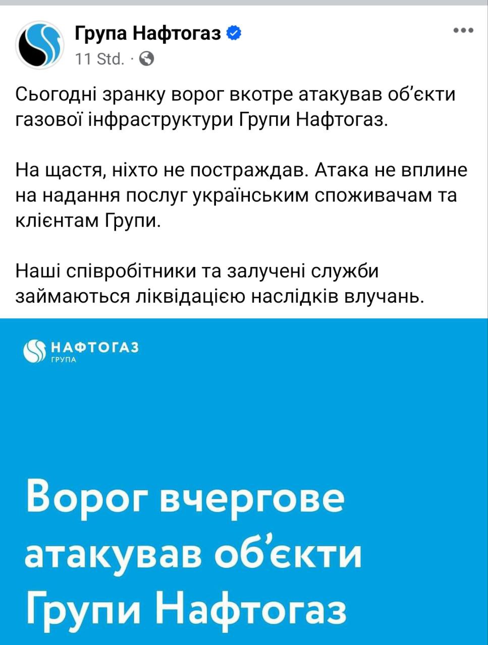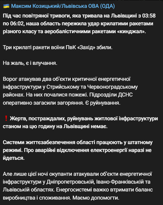 Компания не уточняет, куда был прилёт. Но львовские паблики сообщали о полете ракет в сторону Стрыя Львовской области, где расположено крупное газовое хранилище.