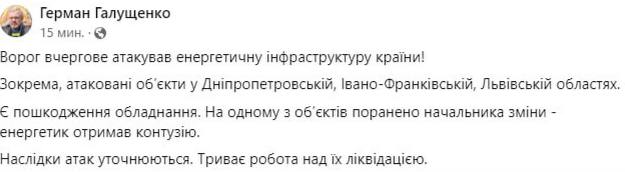 "Есть повреждение оборудования. На одном из объектов ранен начальник смены - энергетик получил контузию. Последствия атак уточняются. Продолжается работа над их ликвидацией", - рассказал министр.