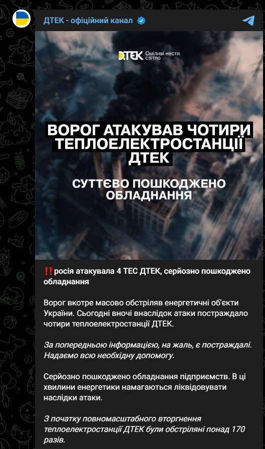08:06 Под российские удары ночью попали четыре электростанции компании ДТЭК. Есть пострадавшие.