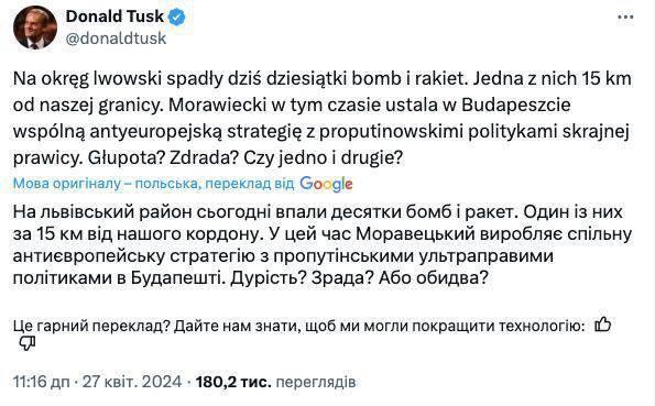 Но написал он это не для того, чтоб пообещать поставить Украине новые системы ПВО "Пэтриот" (поляки уже сказали, что не будут этого делать), а для того, чтоб в очередной раз "наехать" на своих конкурентов из партии "Право и справедливость" в лице экс-премьера Моравецкого, который, по словам Туска, уехал в Будапешт "вырабатывать общую антиевропейскую стратегию с пропутинскими ультраправыми политиками в Будапеште".