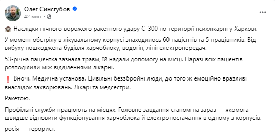Глава Харьковской ОВА Олег Синегубов показал кадры последствия ночного удара С-300 по территории 3-й психиатрической больницы в Харькове.