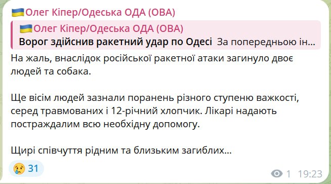 Об этом сообщает в телеграм-канале глава Одесской ОВА Олег Кипер.
