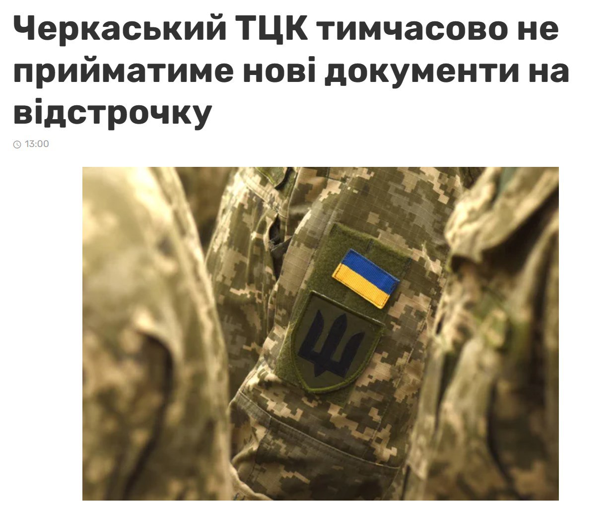 07.58 Черкасский ТЦК прекратил прием документов на отсрочку от мобилизации - до вступления в силу нового закона, который ее ужесточает.