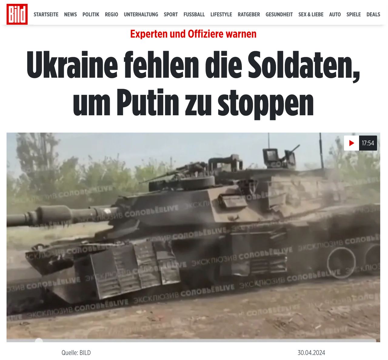 16:11 "Украине не хватает солдат, чтобы остановить Путина". С таким заголовком вышла статья в Bild.
