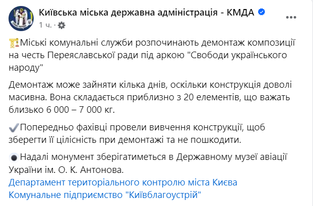 В Киеве начался демонтаж композиции в честь Переяславской рады под Аркой Свободы украинского народа