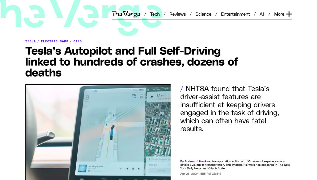 Автопилот Tesla стал причиной сотен аварий и десятков смертей. Транспортное управление США пришло к выводу, что функций помощи водителю Tesla недостаточно для того, чтобы водители были вовлечены в процесс вождения, что часто может иметь фатальные результаты.