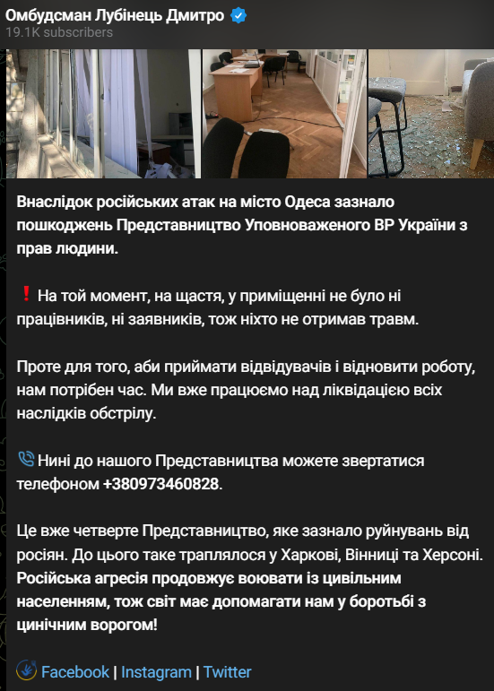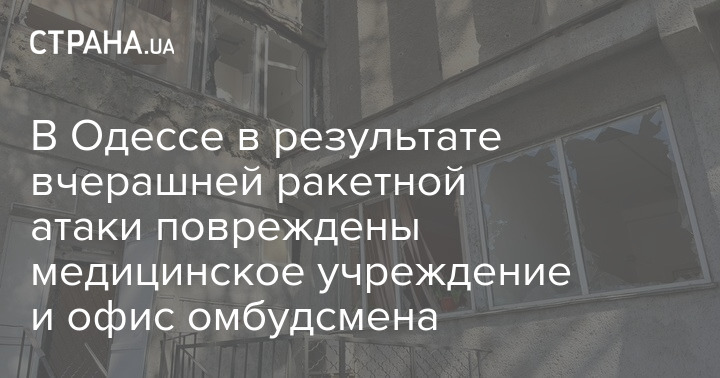 В Одессе в результате вчерашней ракетной атаки повреждены медицинское учреждение и офис омбудсмена