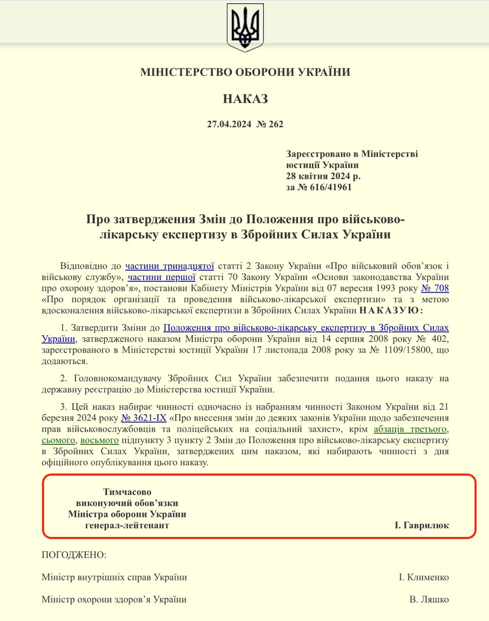 16.02 Украинские паблики обратили внимание, что под приказом Минобороны от 27 апреля с обновленным списком заболеваний, которые определяют пригодность к военной службе, стоит подпись временно исполняющего обязанности министра обороны Гаврилюка, а не министра обороны Умерова.
