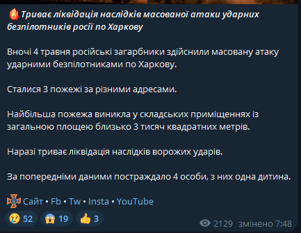 Глава Харьковской ОВА Олег Синегубов заявляет, что в результате попадания обломков горели двухэтажное офисное и складское здание. А также здание шиномонтажа. Пострадали 4 человека.